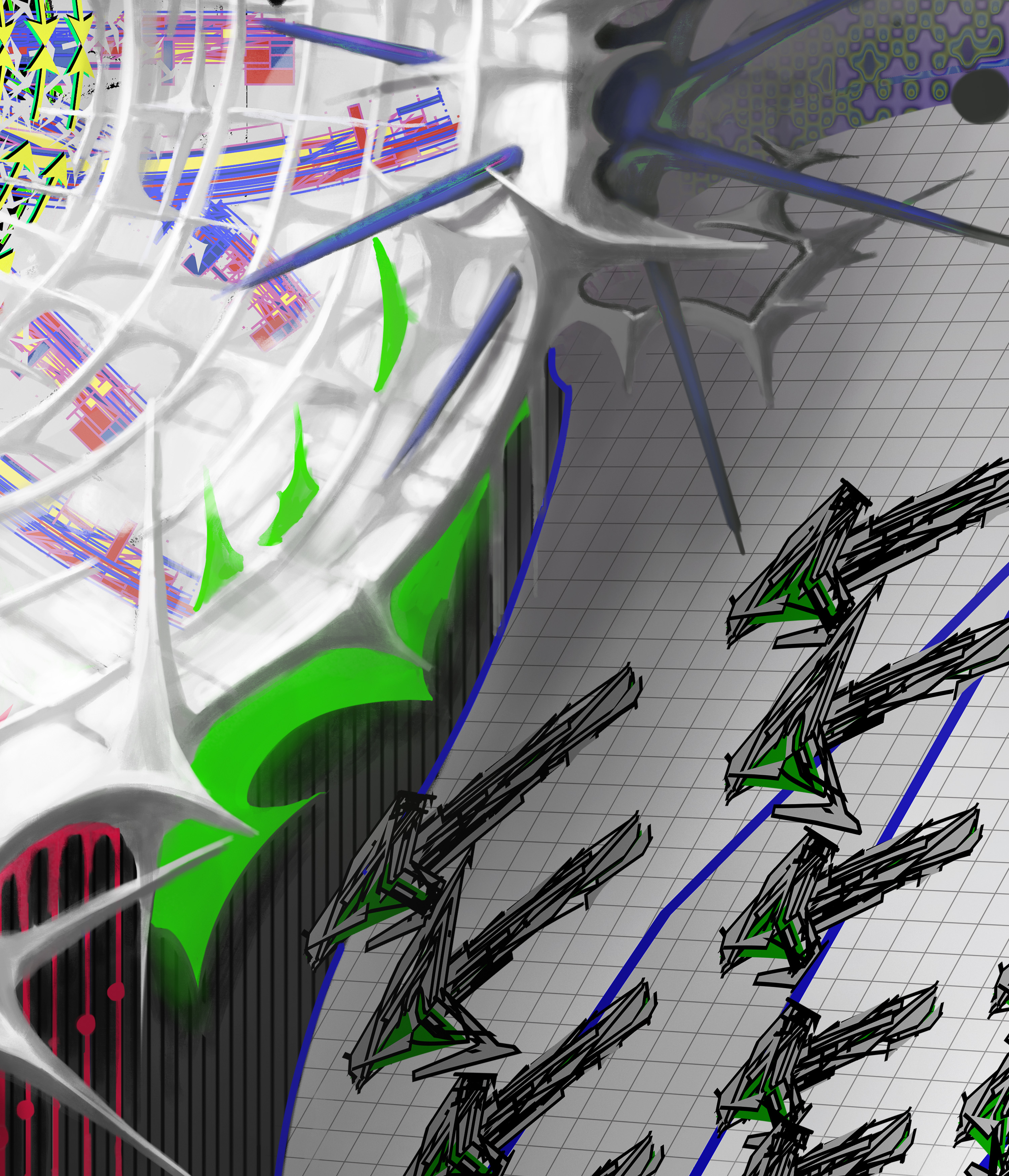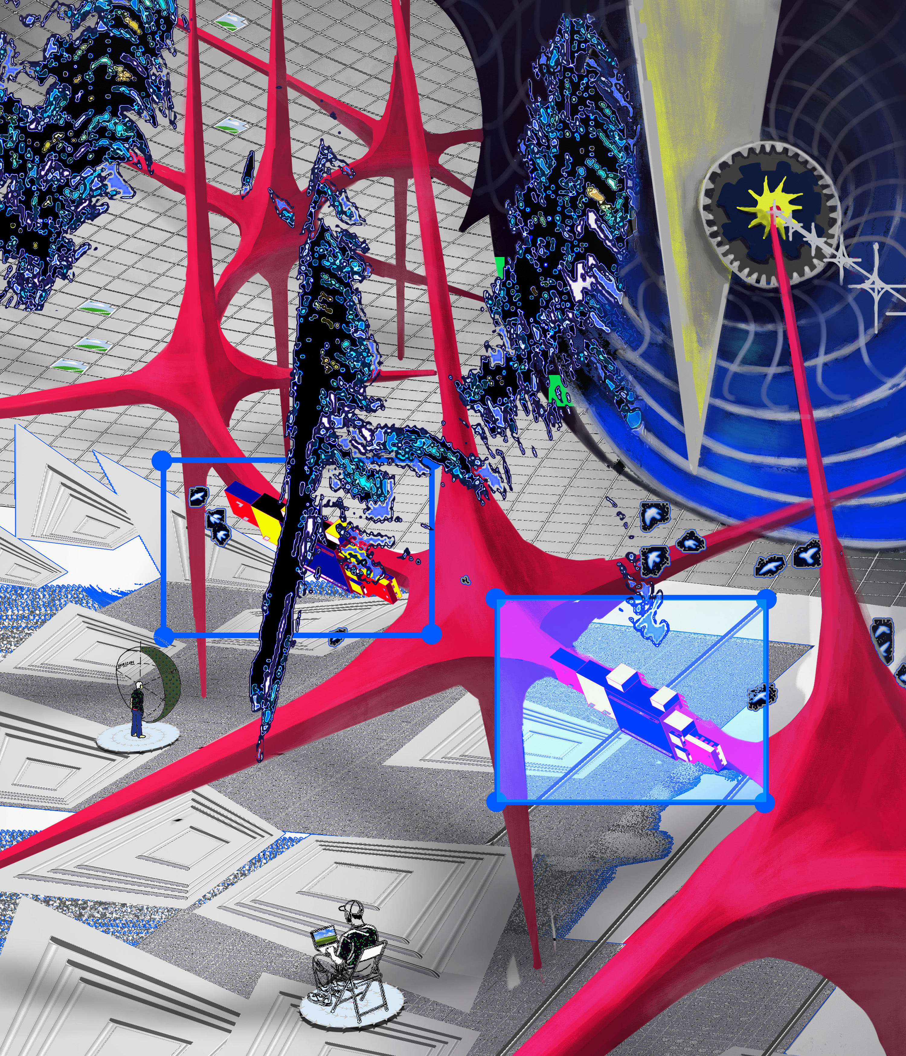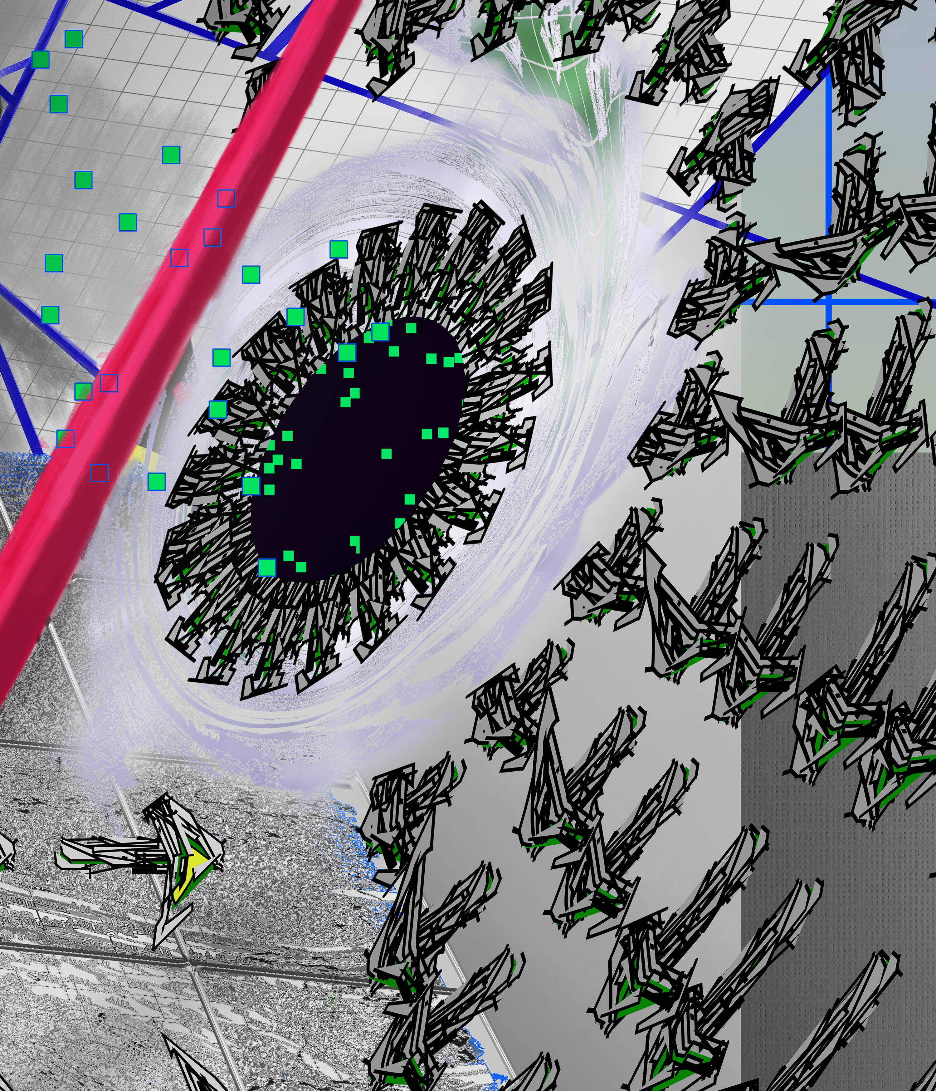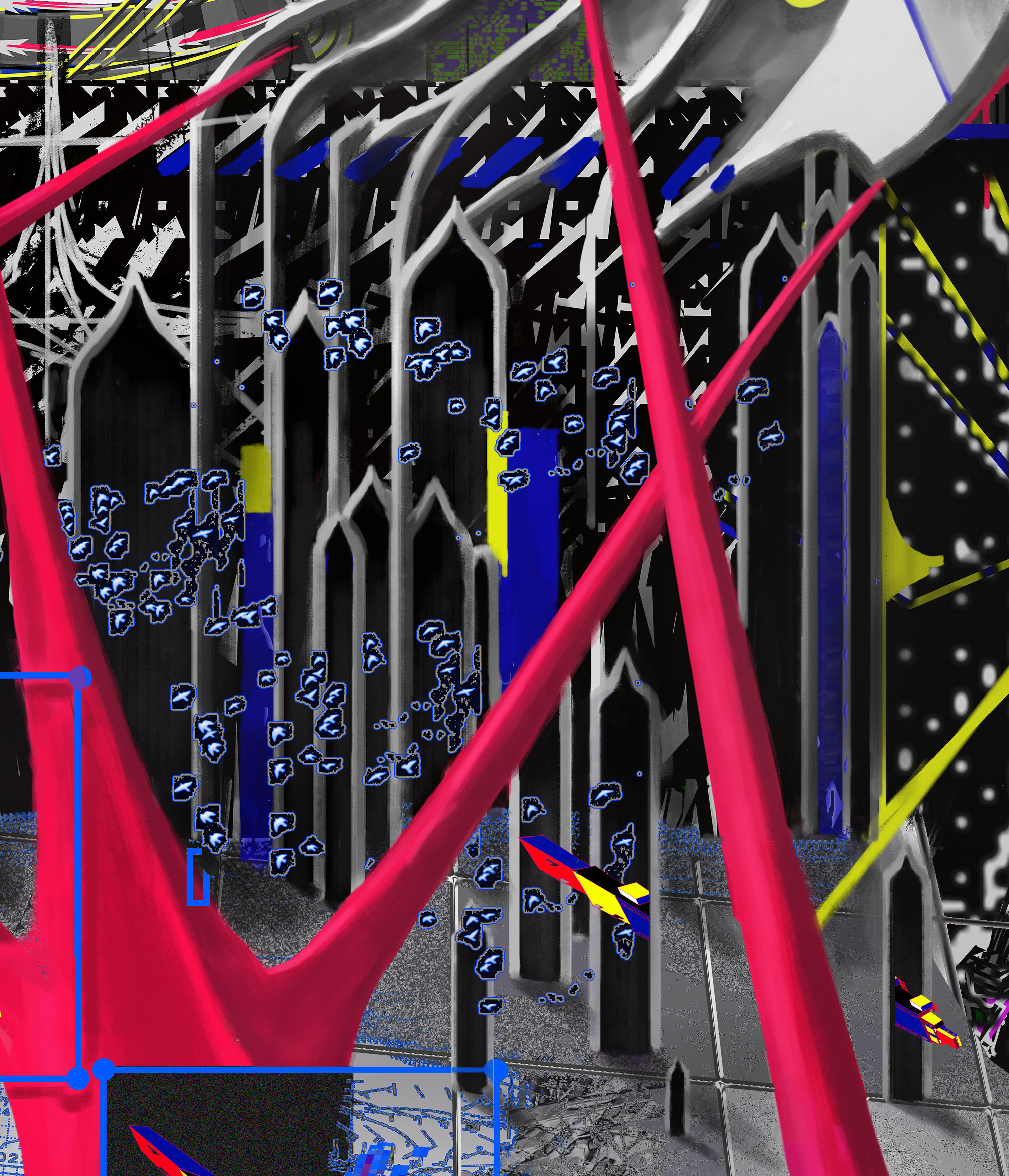 In this collaboration, these two historical trajectories converge. By working across geographical and cultural boundaries, Jesperish and Movsum mirror the international networks that once connected artists across Europe. Their digital environment—composed of grids, swarming vectors, and organic structures—translates the utopian ambitions of modernism into a contemporary visual language shaped by data flows, algorithmic systems, and online collaboration.